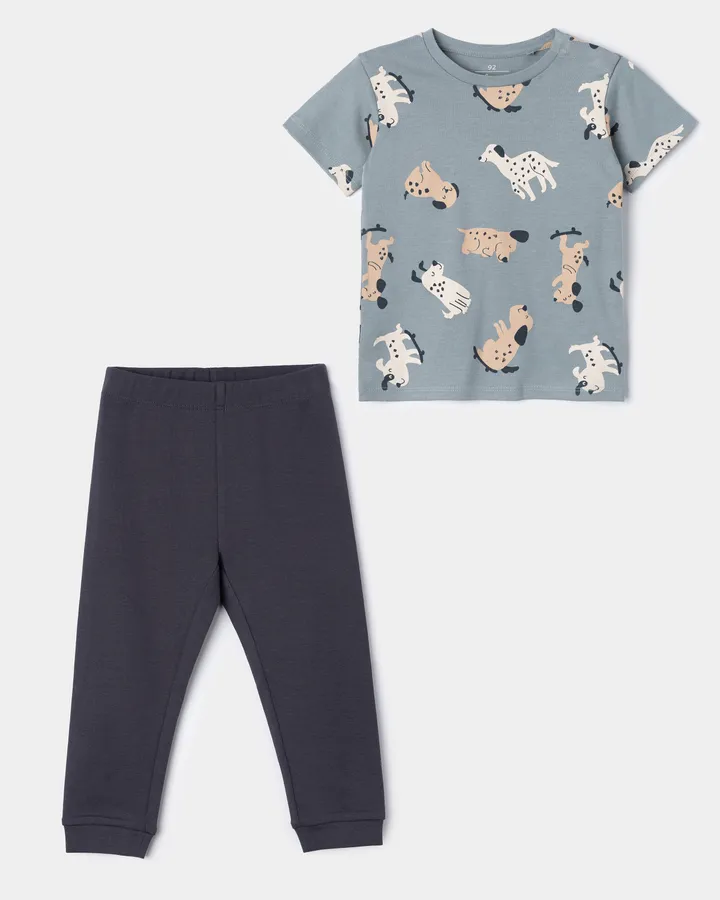 Костюмчик на небольшом флисе . Заказала из-за цены( срочно нужны были костюмы) когла забрала товар , принт не понравился, как будто собаки мертвые , а не спят😬