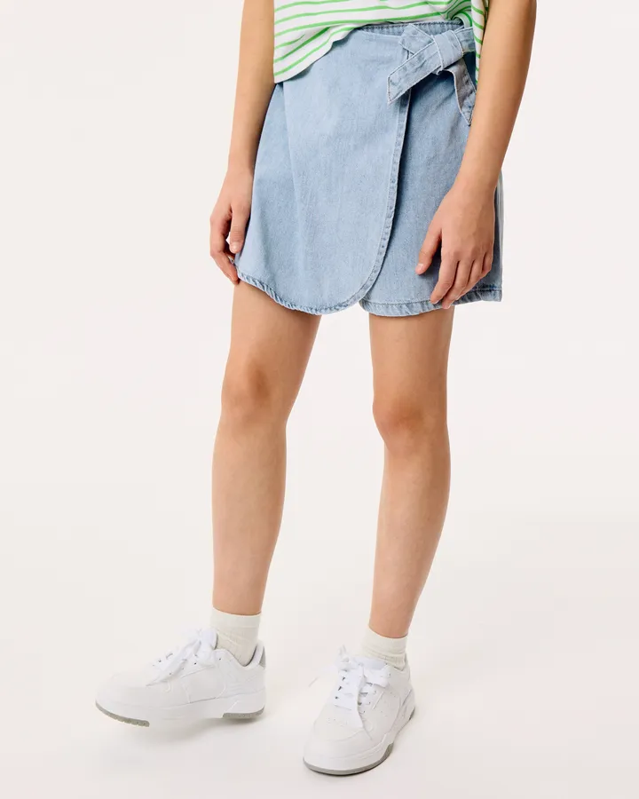 Юбка-шорты сшиты из качественной, небесно голубой джинсы. Идеальный крой, хорошо сидит на стройной девочке,Ино, есть запас, так что и более плотным детям тоже пойдет. Очень стильно и модно.
