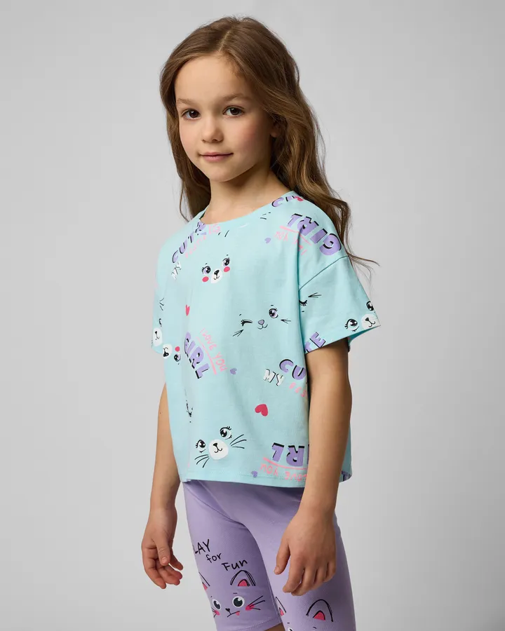 - Футболки для девочек и майки с принтами (цветы, бабочки, герои мультфильмов): Базовые элементы гардероба, которые подходят для игр и прогулок. Принты делают одежду более интересной для детей.