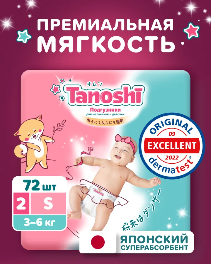 Подгузники Tanoshi S (3-6 кг) 72 шт.