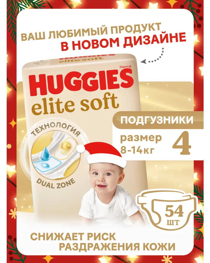 - Elite Soft — самые мягкие подгузники, которые можно использовать для малышей с самого рождения и до 12 месяцев. В состав входит натуральный хлопок и другие мягкие материалы, специальный внутренний слой моментально абсорбирует жидкость и отводит ее от кожи. У пупка предусмотрен специальный вырез, который не травмируют не зажившую кожу новорожденных. Для самых маленьких предусмотрен специальный кармашек для мягкого стула.