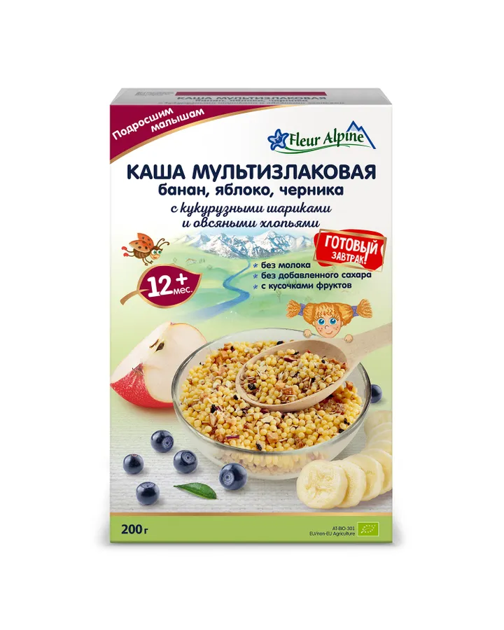 Каша Fleur Alpine мультизлаковая банан-яблоко-черника с кукурузными шариками и овсяными хлопьями 200г с 12месяцев