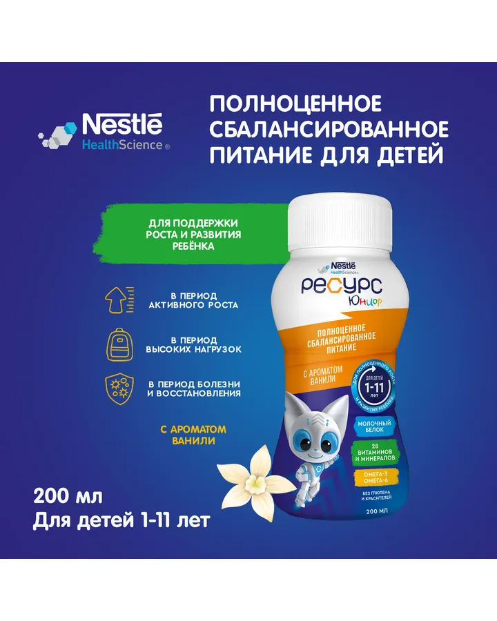 Смесь Nestle Health Science Ресурс Юниор с ароматом ванили 200мл с 12 месяцев
