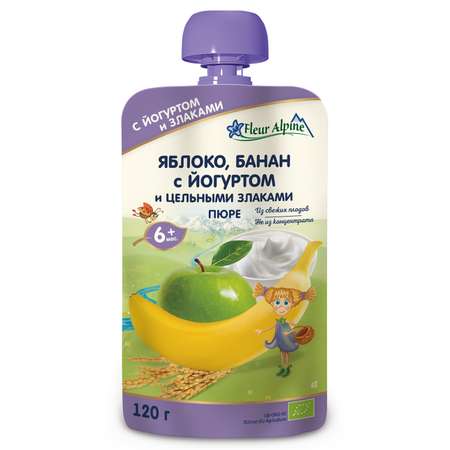 Пюре Fleur Alpine ЯБЛОКО, БАНАН с ЙОГУРТОМ и ЦЕЛЬНЫМИ ЗЛАКАМИ оценят не только малыши, но и дети постарше: