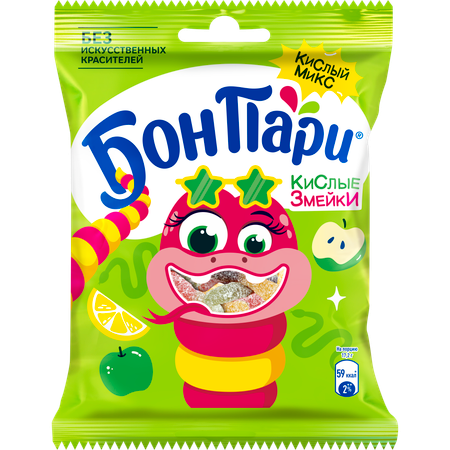 Жевательный мармелад БОН ПАРИ Кислые змейки имеет форму длинных забавных змеек. Выпускается со вкусом фруктов «яблоко-малина» и «лимон-черная смородина» в сахарной обсыпке. Продукт не содержит искусственных красителей.