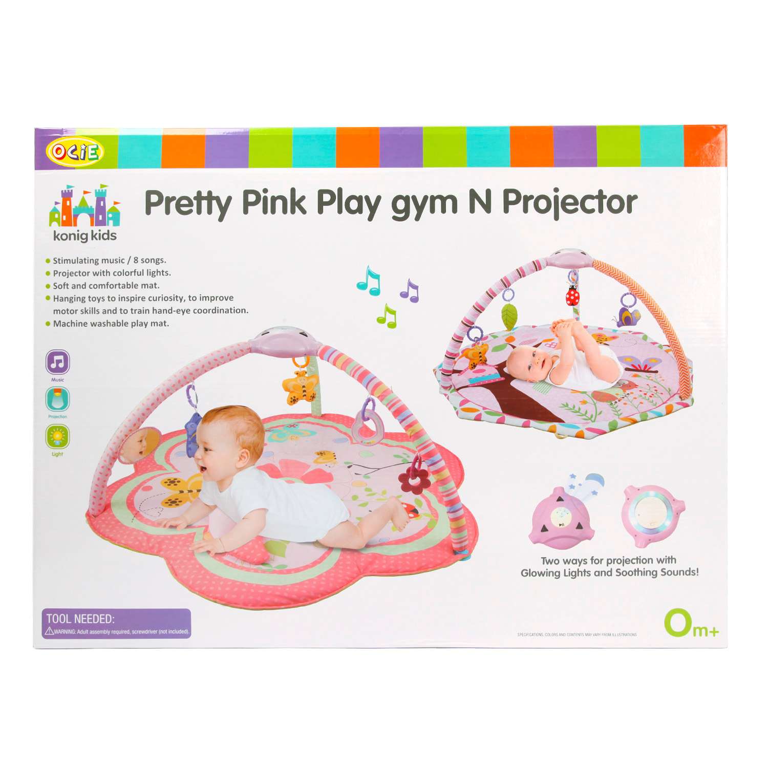 Коврик выполнен в форме матрасика в виде цветочка, с яркими розовыми цветами. Снизу к нему прикреплены дуги, которые сверху соединены проектором с двумя режимами работы: огоньками и приятной успокаивающей музыкой.