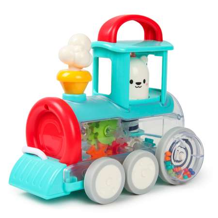 Поезд можно двигать за веревочку или толкать его вперед ручкой. Медвежонок-машинист крутится, а пар двигается вверх-вниз во время движения, что способствует развитию зрительно-двигательной координации у ребенка.