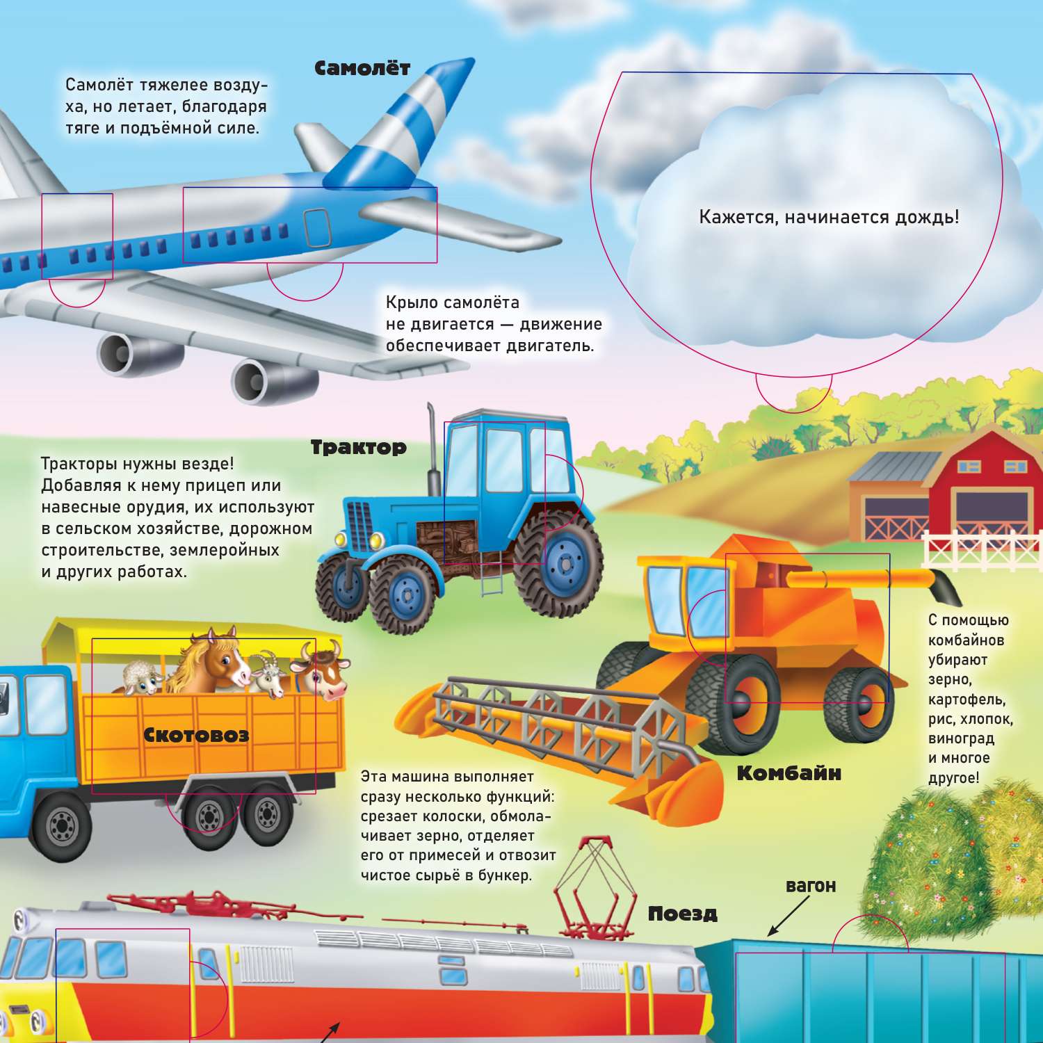 Открывая волшебные окошки, спрятанные на почти метровой панорамной картинке, ваш ребёнок узнает, как устроены 35 видов транспорта, побывает в 7 разных локациях (в городе, на стройке, на ферме, на железной дороге, в небе, на море и на стоянке служебных машин), познакомится с множеством интересных фактов и получит ответы на самые частые вопросы маленьких почемучек о транспорте.