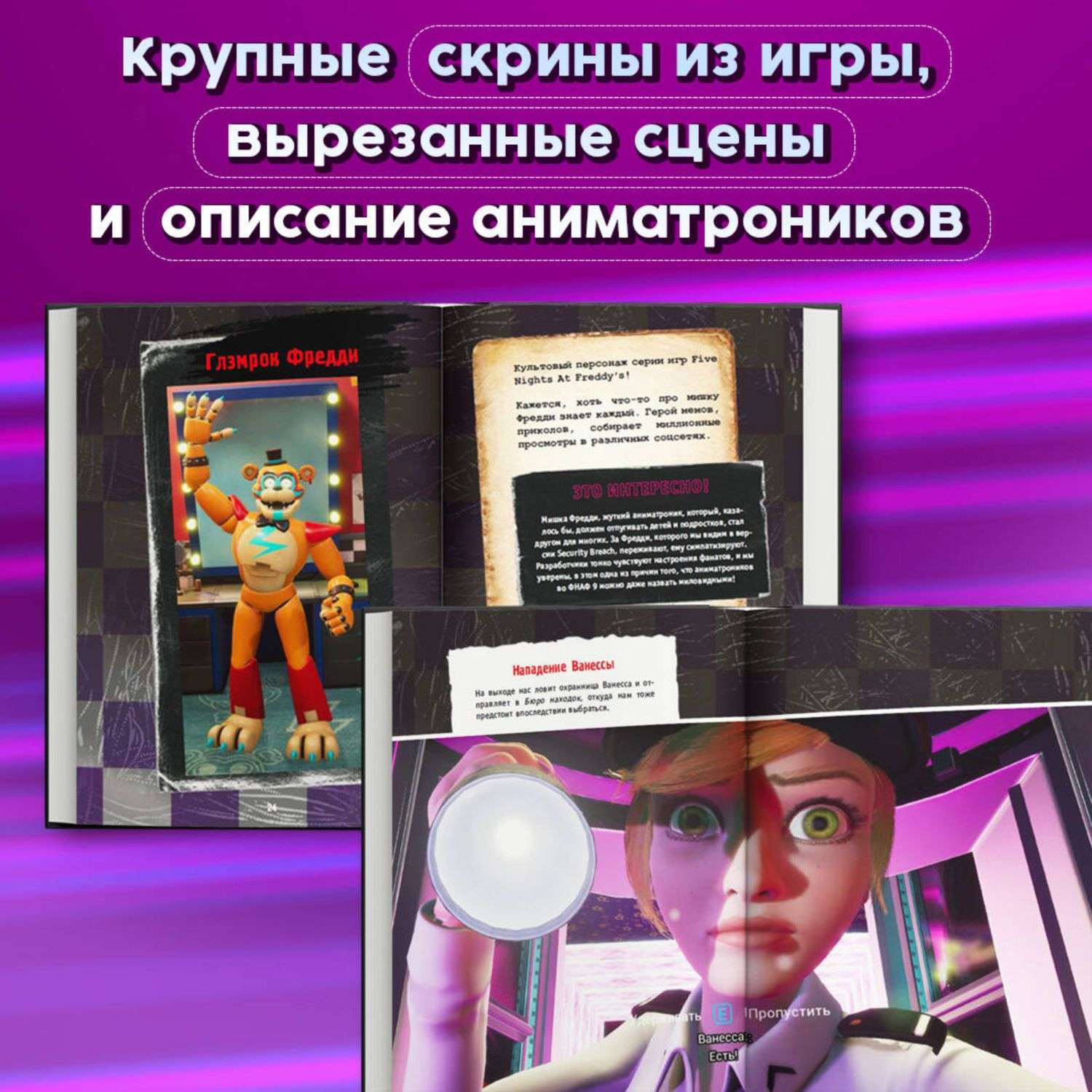 Что же за слова такие — Секьюрити Брич? Как перевести их на русский язык? Расскажем на первых же страницах! Истинная концовка FNAF «Секьюрити Брич»? Обязательно! Кто же такой Бёрнтрап? Подробно! Что такое фаз-часы, и какого цвета гитара Глэмрок Чики? Об этом и многом другом ты узнаешь из уникального гайда «Секьюрити Брич». Крупные скрины из игры, вырезанные сцены, описание аниматроников и персонажей людей.
