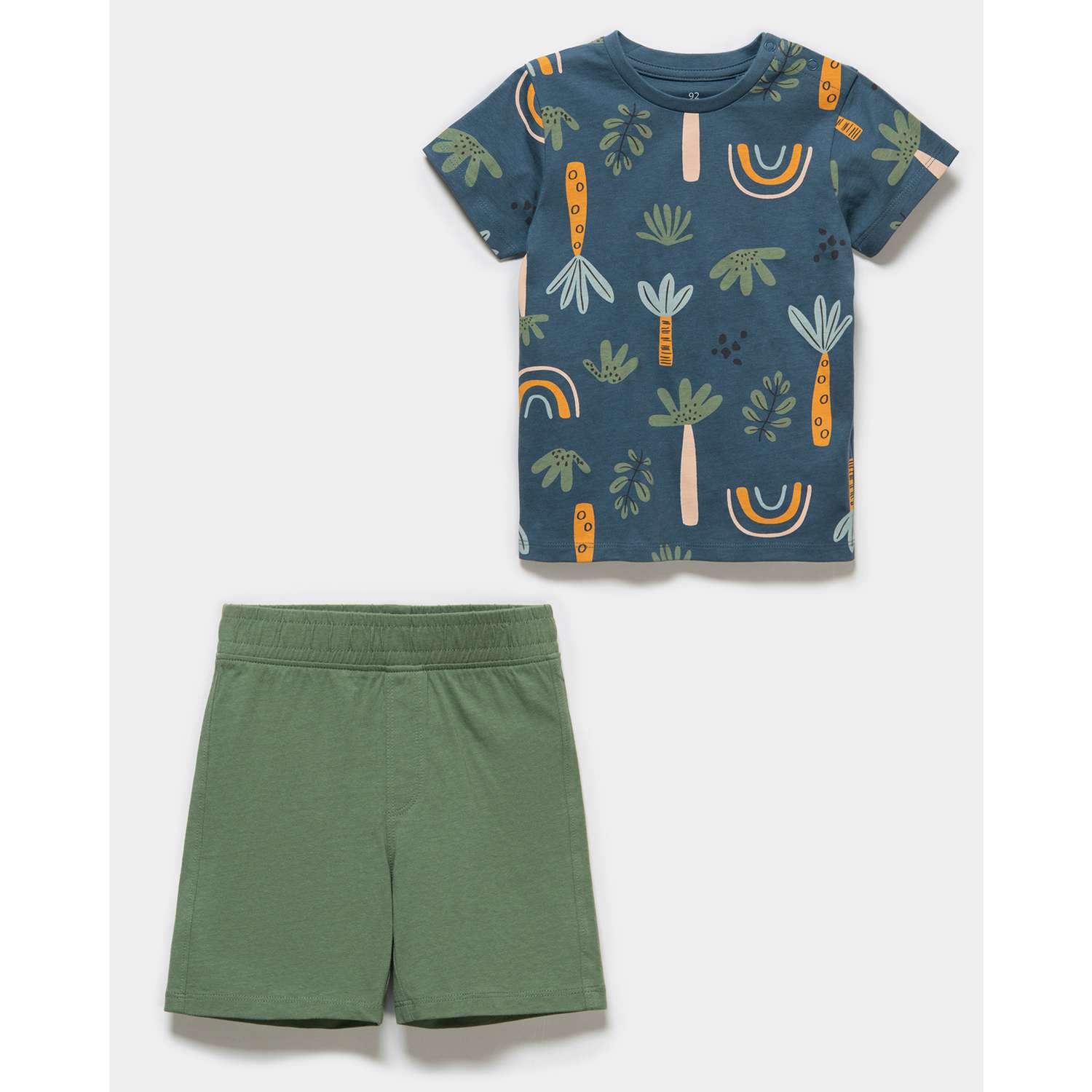 Летний комплект для мальчика Baby Go из синей футболки с цветным принтом и однотонных шорт в цвете хаки.