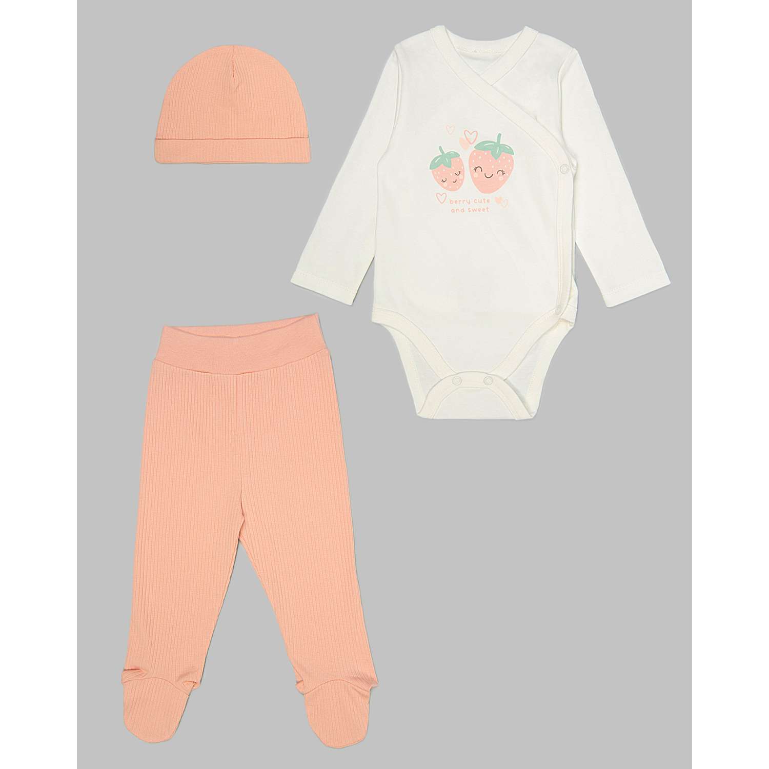 Комплект для девочки Моя Горошинка из трёх предметов: белого боди на запАх с цветным принтом, а также розовых ползунков и шапочки с отворотом. Изделия выполнены из 100% хлопка.