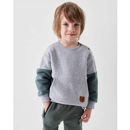Серый свитшот для мальчика BabyGo с вставками в цвете хаки. Декорирован объёмной вышивкой-медвежонком.