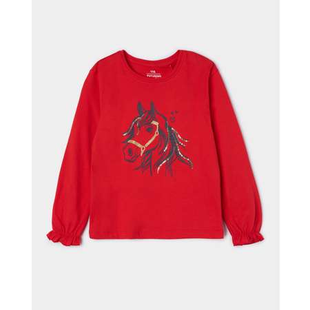 Красный лонгслив для девочки Futurino с блестящим декором в виде лошади - символом 2026 года.