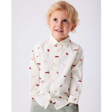Белая новогодняя рубашка для мальчика BabyGo, декорированная цветным принтом.
