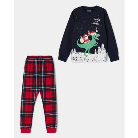 Новогодняя пижама для мальчика Futurino из красных клетчатых брюк и тёмно-синего лонгслива с цветным принтом.