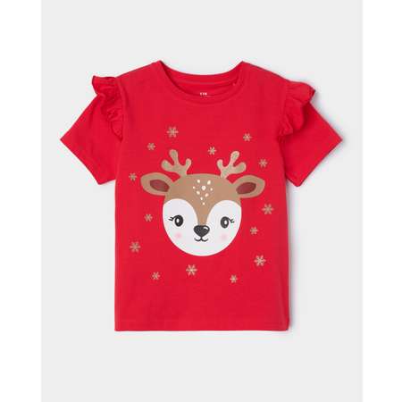 Красная футболка для девочки Futurino, декорированная оборками и новогодним принтом с блёстками.