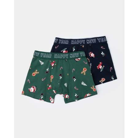 В комплекте Futurino новогодние трусы-боксеры для мальчика, декорированные цветным принтом - зелёные и тёмно-синие.
