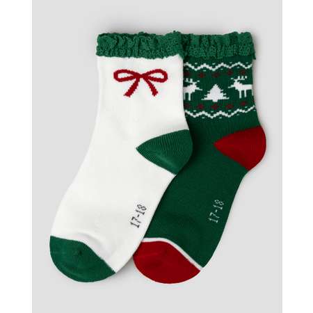 В комплекте Futurino новогодние носки для девочки, декорированные кружеными оборками - белые с бантиками и зелёные с узором.