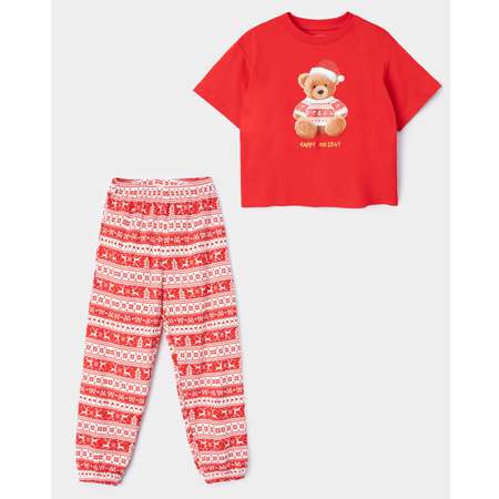 Новогодняя пижама для девочки Futurino из брюк с узором и красной футболки с очаровательным медвежонком.