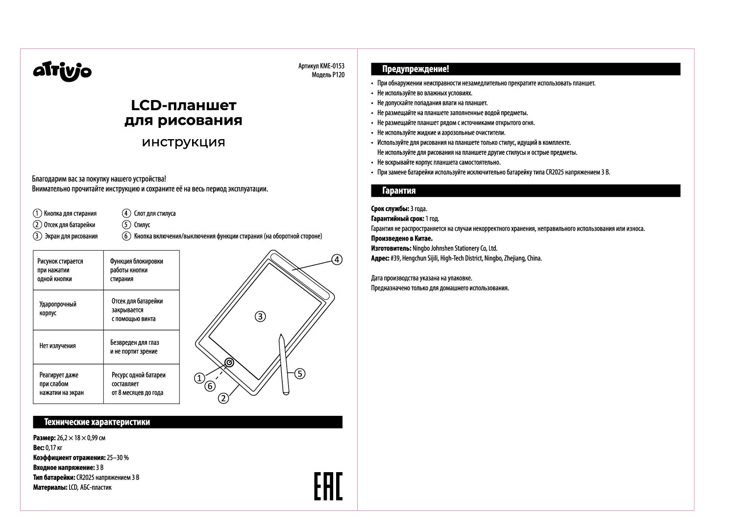 В комплект входит трафарет для рисунков. Планшет работает от батарейки CR2025 напряжением 3 В (в комплекте). Предназначен для детей старше 3 лет.