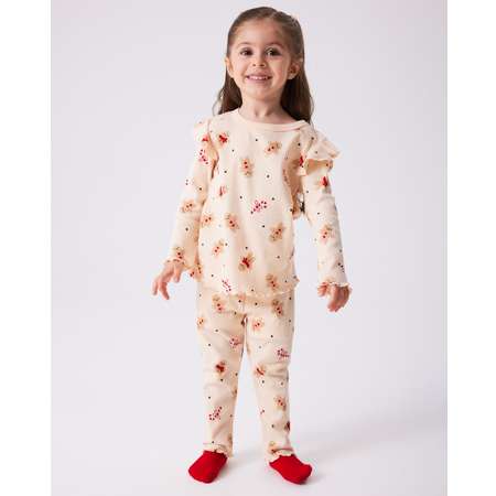 Бежевый новогодний комплект для девочки Моя Горошинка из лонгслива с оборками и легинсов, декорированных принтом с пряничными человечками.