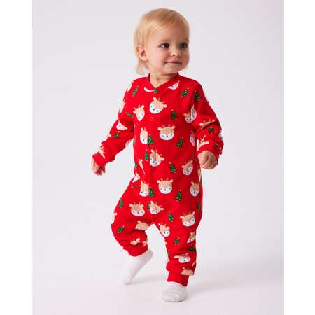 Красный новогодний комбинезон для девочки Моя Горошинка, декорированный принтом с оленями.