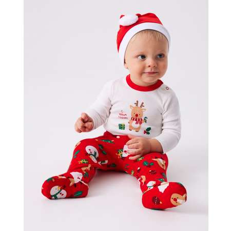 Новогодний комплект для мальчика Моя Горошинка из красных ползунков и белого бди, декорированных цветным принтом.