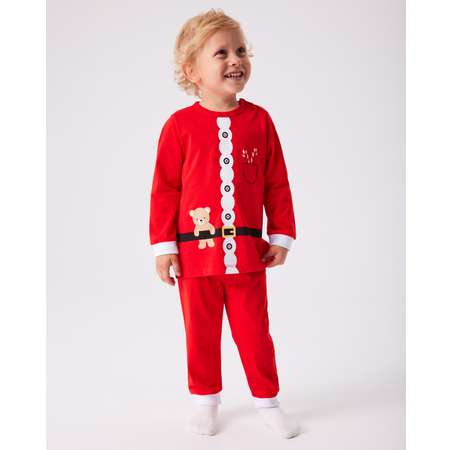 Красный новогодний костюм для мальчика Моя Горошинка из брючек и лонгслива с цветным принтом.