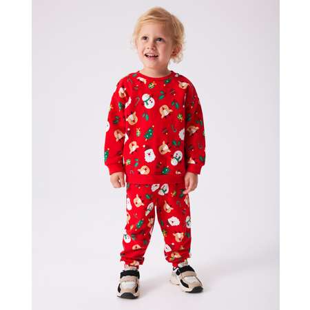 Красный новогодний комплект для мальчика Моя Горошинка из брючек и лонгслива, декорированных принтом со снеговичками.