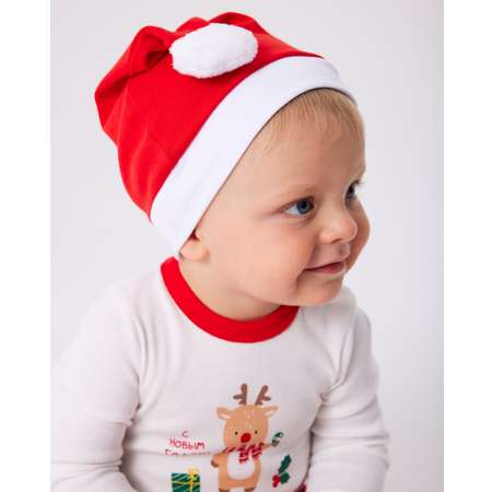 Красный новогодний колпачок для малышей Моя Горошинка с пушистым помпоном. Выполнен из 100% хлопка, не вызывает раздражения и аллергии.