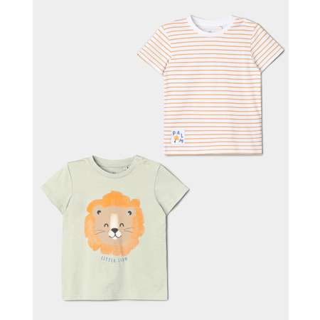 В комплекте BabyGо две футболки для мальчика - полосатая с нашивкой и зелёная с цветным принтом.