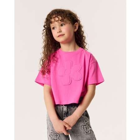 Укороченная футболка для девочки Futurino Fashion цвета фуксии с цветочным декором и фирменной нашивкой.