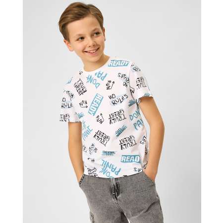 Белая футболка для мальчика Futurino, декорированная цветным принтом с надписями.