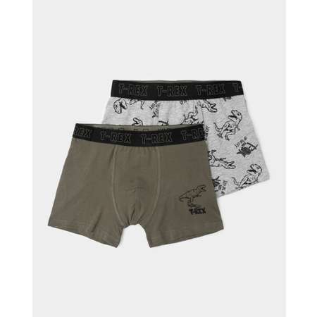 В комплекте Futurino две модели трусов-боксеров для мальчика, декорированные принтом с динозаврами - светло-серые и в цвете хаки.