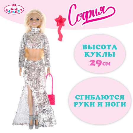 Модница София одета в стильный костюм, украшенный серебристыми пайетками и состоящий из укороченной кофточки с воротником под горло и длинной юбки с разрезом. Образ дополняют элегантные серьги и туфли на высоком каблуке. Одежду и аксессуары легко снять и надеть. С такой модной куклой девочке будет интересно и весело играть: благодаря тому, что руки и ноги куклы подвижны, им можно придать любое положение. У Софии светлые длинные волосы, которые хозяйка куклы сможет заплетать в разные причёски. Детально проработанный дизайн игрушки вдохновит девочку на новые игровые сюжеты.