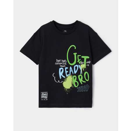Чёрная футболка для мальчика Futurino, декорированная нашивкой и ярким принтом в стиле граффити.