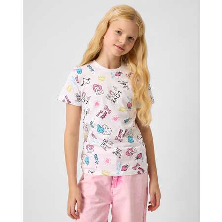 Белая футболка для девочки Futurino, декорированная ярким разноцветным принтом.