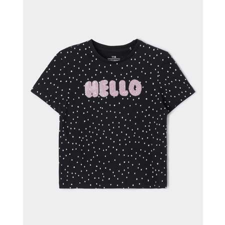Чёрная футболка для девочки Futurino с принтом в горошек и надписью из пайеток "Hello".