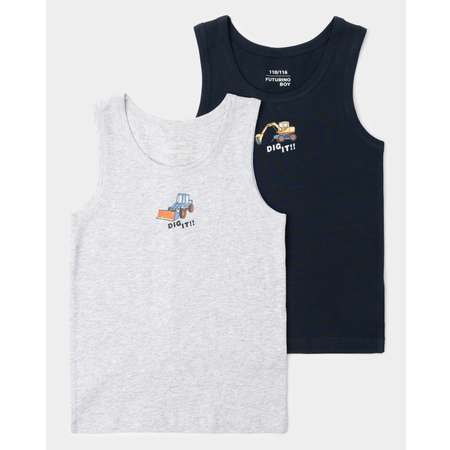 В комплекте Futurino две бельевые майки для мальчика, декорированные цветным принтом - серая и тёмно-синяя.