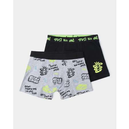В комплекте Futurino две модели трусов-боксеров для мальчика, декорированные ярким принтом в стиле граффити - чёрные и серые меланжевые.