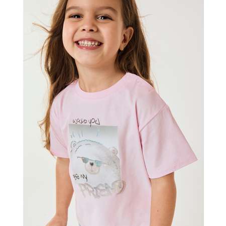 Розовая футболка для девочки Baby Gо Trend, декорированная блестящим принтом с медвежонком.