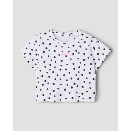 Укороченная футболка для девочки Futurino белого цвета в горошек с надписью "Dreams".