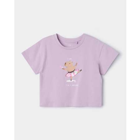Фиолетовая укороченная футболка для девочки Futurino, декорированная принтом с капибарой.