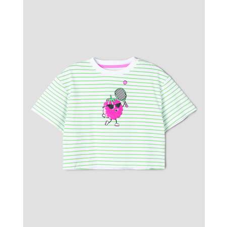 Укороченная футболка для девочки Futurino Fashion в зелёную полоску, декорированная принтом с пайетками.