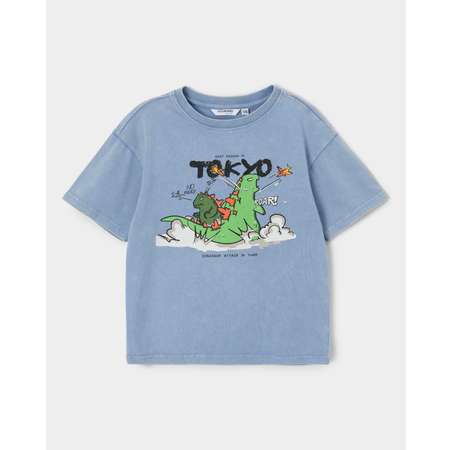 Голубая футболка для мальчика Futurino, декорированная цветным принтом с динозаврами.