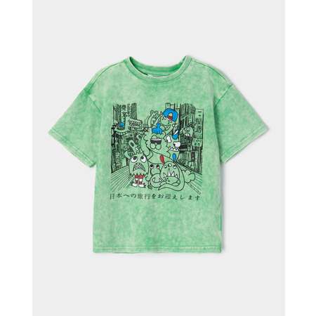 Зелёная футболка для мальчика Futurino, декорированная цветным принтом с забавными монстриками.