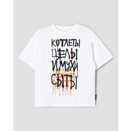Белая футболка для мальчика Futurino Fashion с принтом "Котлеты целы и мухи сыты".