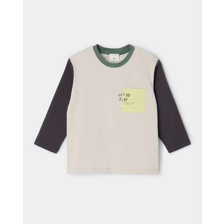 Серый лонгслив для мальчика BabyGо с контрастными рукавами, декорированный однотонной надписью на нагрудном кармане.