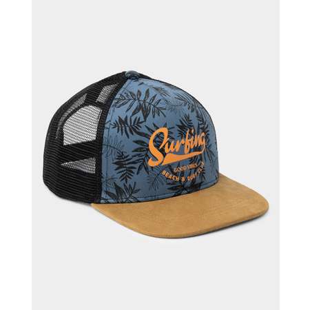 Тёмно-синяя кепка для мальчика Futurino с тропическим принтом и яркой надписью.