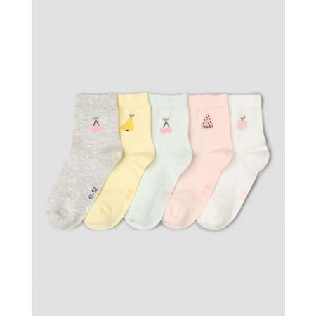 В комплекте Futurino пять пар носков для девочки, декорированных цветным принтом - светло-зелёные, жёлтые, белые, розовые и серые.
